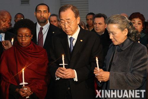 1月19日,在紐約聯(lián)合國總部,聯(lián)合國秘書長潘基文(前中)手持蠟燭參加為海地地震遇難者舉行的燭光悼念活動。當日,聯(lián)合國總部舉行花圈敬獻儀式和燭光悼念活動,向在海地地震中遇難的聯(lián)合國工作人員及所有的地震遇難者表示哀悼。新華社發(fā)