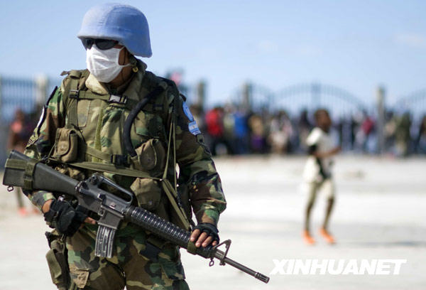 1月16日,一名士兵在海地首都太子港一家公園內的安置點內警戒。
