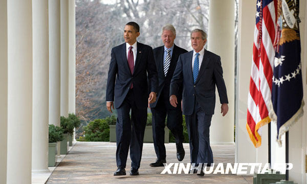 1月16日,美國總統(tǒng)奧巴馬(左)和兩位前總統(tǒng)克林頓(中)、小布什(右)在白宮出席新聞發(fā)布會。新華社/法新