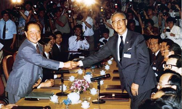 1993年4月27日—29日海峽兩岸關(guān)系協(xié)會(huì)會(huì)長(zhǎng)汪道涵和臺(tái)灣海峽交流基金會(huì)董事長(zhǎng)辜振甫在新加坡舉行會(huì)談并簽訂《汪辜會(huì)談共同協(xié)議》等四項(xiàng)協(xié)議。這是海峽兩岸授權(quán)民間機(jī)構(gòu)領(lǐng)導(dǎo)人的第一次會(huì)談。