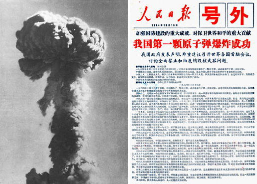 1964年10月16日15時(shí),中國在西部地區(qū)爆炸了一顆原子彈,成功地實(shí)現(xiàn)了第一次核實(shí)驗(yàn)。