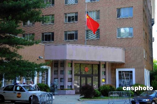 資料圖片:中國駐美大使館老館——坐落美國華盛頓特區西北區的“溫莎公園”旅館。圖為去年五月十九日,中國為四川地震死難者進行全國哀悼的第一天,駐美大使館降半旗悼念死難同胞。 中新社發 邱江波 攝