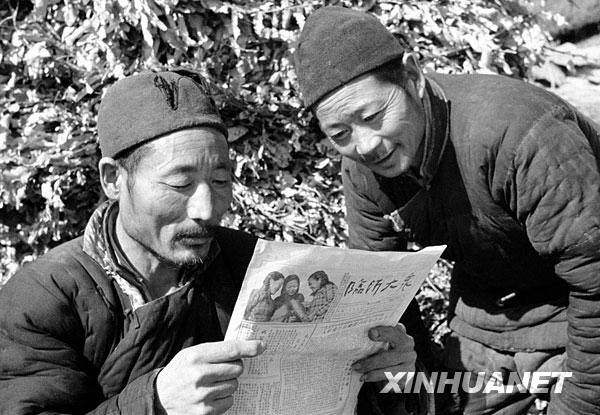 這是山東省莒南縣高家柳溝村50多歲的農民沈相余(左)正在讀報(1956年攝)。曾經不識字的沈相余通過參加記工學習班能夠閱讀報紙。新華社發