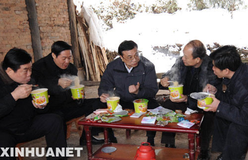 這是1月31日,李克強(qiáng)乘坐裝有防滑鏈的汽車在崎嶇覆冰的山路上行進(jìn)3個小時,來到川北山區(qū)宣漢縣老君鄉(xiāng)紫云村。在察看災(zāi)情、慰問群眾后,就和隨行陪同的領(lǐng)導(dǎo)一起邊用餐邊研究救災(zāi)工作。飯后,又繼續(xù)驅(qū)車到下一個村子慰問。 新華社記者 李學(xué)仁 攝