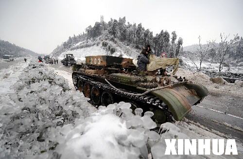 2月3日,解放軍某部出動坦克牽引車支援京珠高速湖南段疏通。 新華社發(fā)