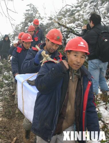 這是搶修萍鄉(xiāng)電網(wǎng)的工人們從山下扛上來他們的“除夕午餐”。 新華社記者林艷興攝