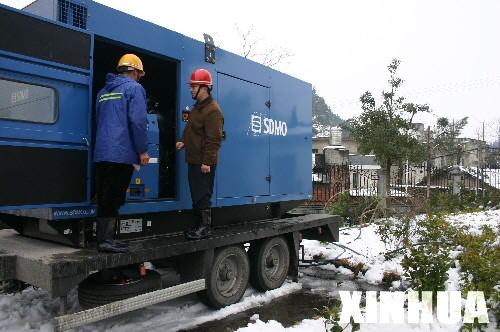 這是蘆溪縣供電公司的職工在武功山風(fēng)景區(qū)管委會(huì)大院的雪地里安裝從浙江運(yùn)來的移動(dòng)電站。 新華社記者林艷興攝