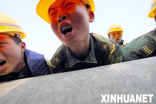 2月14日,部隊官兵在搬運電線桿。新華社發(黃曉海 攝)