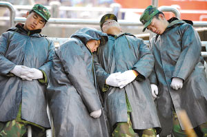 2月14日出版的廣州日?qǐng)?bào),在頭版頭條位置用半個(gè)版的大幅照片刊登了一則尋人啟事,尋找照片中4名累得“站著都能睡著”的子弟兵。這是個(gè)令人震撼的瞬間:時(shí)間定格在廣州春運(yùn)最緊張的2月4日,畫面中,4名年輕的戰(zhàn)士身穿雨衣,斜倚在火車站廣場(chǎng)的護(hù)欄上,靜靜地睡著了。當(dāng)時(shí),廣州最低氣溫只有4℃,天剛下過(guò)小雨,只有極度的疲憊,才能這樣站著睡著。戰(zhàn)士睡著了,卻感動(dòng)著千千萬(wàn)萬(wàn)的廣州市民。如今,部隊(duì)已經(jīng)回撤,照片上的這4名可愛(ài)的戰(zhàn)士是誰(shuí)呢?他們屬于哪個(gè)部隊(duì)?他們是不是至今仍?shī)^戰(zhàn)在抗災(zāi)救災(zāi)的第一線?