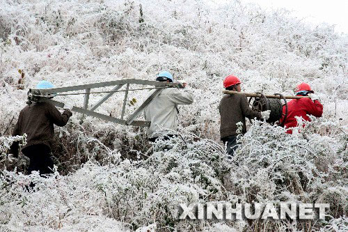 1月22日,凱里市供電部門職工趕往事故現場搶修供電設施。受大面積冰凍災害天氣影響,貴州電網多處線路受損,黔東南苗族侗族自治州和銅仁地區有9個縣停止供電。凱里電網2000多名職工投入“抗冰保電”一線晝夜搶修。 新華社發(吳如雄 攝)