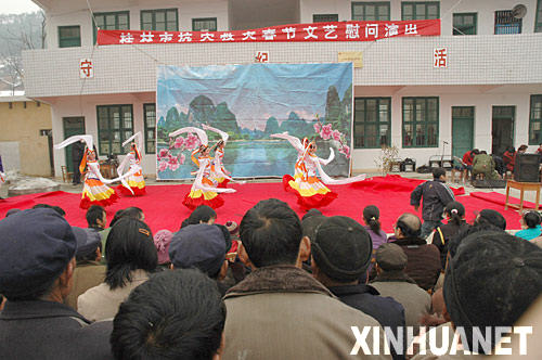 當日,桂林市彩調劇團來到桂林受冰雪災害影響最嚴重的灌陽縣龍橋村,為災區群眾獻上一臺精彩的文藝演出,受到群眾的歡迎。 新華社發(楊紹功攝)