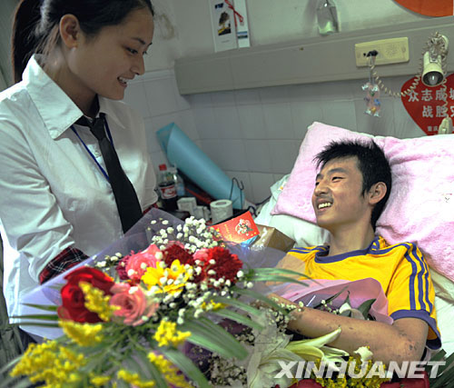 5月24日,來(lái)自四川省北川中學(xué)的廖波在重慶市南桐總醫(yī)院度過(guò)了他17歲的生日。5月13日,廖波被救援隊(duì)員從北川中學(xué)的廢墟中搶救出來(lái),18日被轉(zhuǎn)移到重慶接受進(jìn)一步治療。面對(duì)突如其來(lái)的災(zāi)難,廖波始終堅(jiān)強(qiáng),這位因?yàn)榈卣鹗プ笮⊥鹊闹袑W(xué)生在病床上始終面帶充滿希望的笑容。 新華社記者 周衡義攝