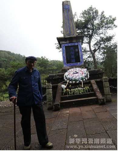 抗戰老兵張慶斌在國殤墓園的民族英雄紀念塔前悼念戰友。張慶斌今年87歲,河南唐河縣人,新中國成立以后在騰沖城關中心小學教書,后調到騰沖縣教育局工作 新華社記者 藺以光 攝