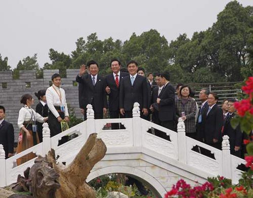 陳云林等一行人離臺(tái)前參觀臺(tái)北花博,花博9點(diǎn)開園,陳云林參觀時(shí)間特地提早一個(gè)小時(shí),8點(diǎn)多就到花博園區(qū),陳云林先逛圓山園區(qū)爭(zhēng)艷館,再到大陸參展的西安庭園及上海豫園,陳云林與海基會(huì)長(zhǎng)江炳坤、臺(tái)北市長(zhǎng)郝龍斌還特地在上海庭園的造橋上拍照留戀,接著參觀流行館及花博最熱門的夢(mèng)想館。