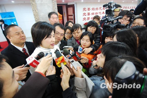 1月28日,廣東省政協十屆三次會議開幕,來自香港的政協委員吳小莉被媒體記者層層包圍。中新社發 柯小軍 攝