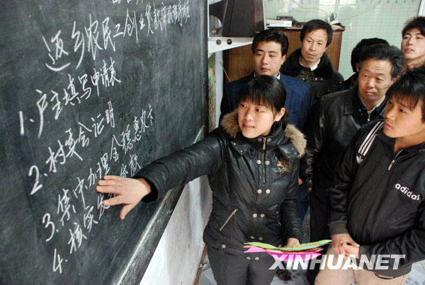 2009年3月1日,河南省湯陰縣白營鄉后灣張村大學生村官鄭芳芳正在向村里的返鄉農民工講解縣農行小額創業貸款申報程序。為幫助返鄉農民工和農村富余勞動力就業,河南省湯陰縣大力實施農民“三戶聯保”創業信貸工程,以小額信貸的方式,幫助農民工就業創業。新華社發