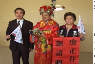 據臺媒報道,由中國民黨征召參選第七屆“立法”委員選舉的前桃園縣副縣長廖正井,17日在夫人楊啟津及上百名鄉親陪同下,打扮成財神爺,手拿三腳蟾蜍,前來完成參選登記手續。廖正井表示,若當選后,就要做的就是,能帶動青埔高鐵站附近繁榮發展的公共設施,例如副縣長任內所提的巨蛋棒球場及世貿展覽館的興建。