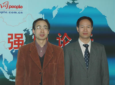 2006年2月,中國社會科學(xué)院臺灣研究所經(jīng)濟(jì)室主任孫升亮(右)、研究員王建民(左)接受人民網(wǎng)訪問。(圖片來源:人民網(wǎng))