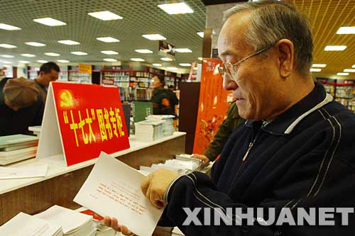 11月1日,一位讀者在翻看十七大報告蒙古文單行本。當日,十七大報告蒙古文單行本在呼和浩特市內蒙古新華書店圖書大廈與讀者見面。新華社記者李睿攝
