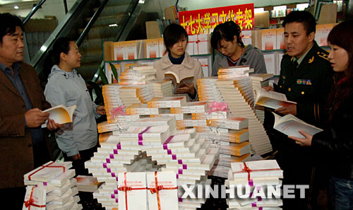 10月30日,西安讀者在“十七大學習文件專架”前選購圖書。近日,陜西省西安市新華書店設(shè)立“十七大學習文件專架”,相關(guān)圖書受到讀者歡迎。 新華社記者 丁海濤 攝