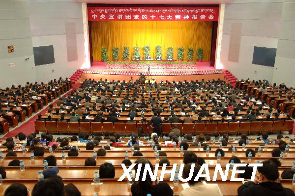 11月11日,中央宣講團(tuán)黨的十七大精神報(bào)告會(huì)在拉薩舉行,西藏各族各界1000多人與會(huì),聆聽中央宣講團(tuán)成員的報(bào)告。(新華社記者覺果攝)