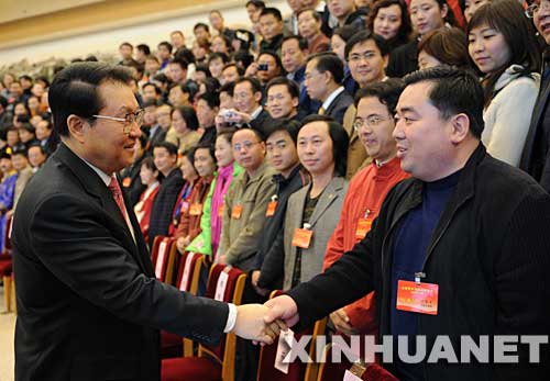 11月13日,全國青年作家創作會議在北京召開。中共中央政治局常委李長春出席會議并講話。這是李長春接見出席會議的代表。 新華社記者李學仁攝