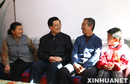 11月17日至19日,中共中央總書記、國家主席、中央軍委主席胡錦濤在內蒙古自治區考察工作。這是胡錦濤在呼和浩特市新城區西落鳳街低保戶周云家中噓寒問暖。 新華社記者鞠鵬攝
