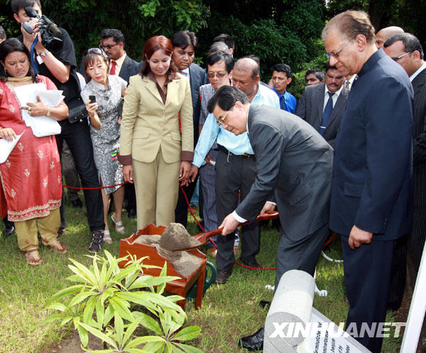 2月17日,國家主席胡錦濤在毛里求斯植物園種植象征中毛友誼萬古長青的香木樹。新華社記者鞠鵬攝