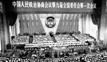 | 1998年3月3日,中國人民政治協商會議第九屆全國委員會第一次會議在北京人民大會堂隆重開幕。圖為大會會場。本報記者 李石營攝 |