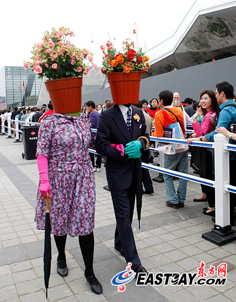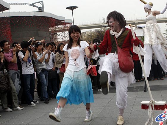 精彩紛呈的世博會,吸引了八方游客前來觀展。穿梭在展館之間的行為藝術表演,也是觀眾不容錯過的節目。更有觀眾自發上陣,支持世博,堪稱一絕。圖為在德國館前,行為藝術表演者吸引眾多觀眾駐足觀賞。(記者:劉歆?攝)