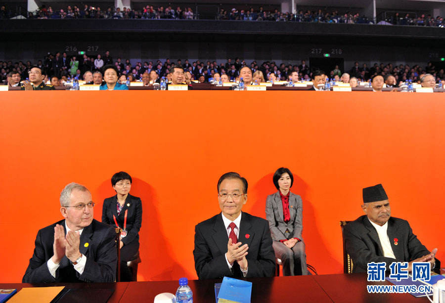 10月31日晚,中國2010年上海世博會閉幕式在世博文化中心舉行。這是中國國務院總理溫家寶同中外嘉賓在主席臺就座。 新華社記者黃敬文攝