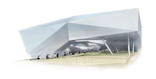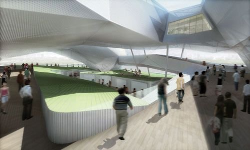 展示在我們眼前的是一個由透明的銀色發(fā)光建筑膜包裹的建筑體,它漂浮于幾根支撐結構上,怎么看,都像是一座可漫步其間的三維空間體雕塑。起落有致的坡型景區(qū)從底層向