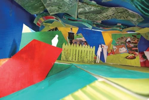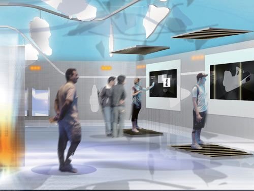 觀眾每二十人一組被請入展廳,穿過一個暗室,登上電動滾梯,之后穿行于一條隧道。頓時,“火車、汽車、公共汽車”交替出現,廣播報站聲,鳥兒啾啾鳴囀,水上蕩舟的孩子們歡樂的笑聲不絕于耳——當然,這只是一個用多媒體創(chuàng)意制作的美妙世界,指示著“你已進入德國城市”。