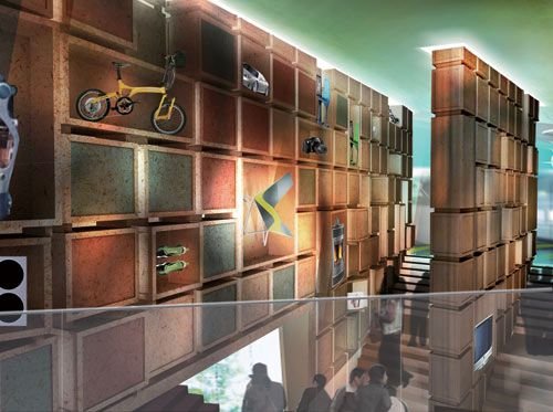 隨后便是一個充滿著創(chuàng)意的空間——“創(chuàng)新工廠”。這是一個光線暗淡、紅光閃爍的大廳。在高至屋頂的大架上,陳列著眾多來自德國的日常生活用品和與眾不同的發(fā)明、設計作品。奇妙的是,“這間大廳中的一切都處于運動中”!傳輸帶在人們的上空穿梭往來,滿載著總共90多件展品,能看到LED燈、獨特的帶鬧鐘半導體、玩具拖拉機、自行車安全帽,以及有名的LikeaBike兒童學步車??工廠一角還有各種生產材料,你可以用手去觸摸,挺有意思,讓人能真正感而悟之。