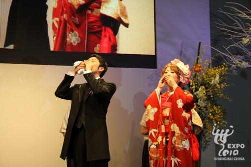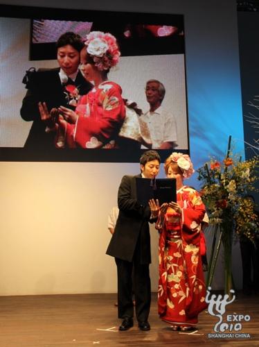 日本產(chǎn)業(yè)館JAL舞臺(tái)上,來(lái)自橫濱的新郎岡陽(yáng)介身穿西式禮服首先登場(chǎng)。之后,同樣來(lái)自橫濱的新娘岡美緒身著正紅色、由3層衣服組成的日本傳統(tǒng)服飾――和服,腳踩木屐,在父親的引領(lǐng)下出現(xiàn)在觀眾面前。在兩位新人宣讀誓言、喝下交杯酒后,一位現(xiàn)場(chǎng)觀眾被邀請(qǐng)上臺(tái)作為證婚人之一,和新娘父母、主持人、歌手小松拓也一起在結(jié)婚證明書上簽字,見(jiàn)證兩人的結(jié)合。隨后,新人互換戒指,新郎向新娘送上深情一吻,至此,兩位新人正式結(jié)為夫婦,而現(xiàn)場(chǎng)觀眾也在此時(shí)送上了陣陣掌聲和祝福。