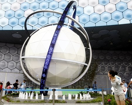 信息通信館前的“夢想地球儀”上滾動著“甜言蜜語”。 早報世博記者 張棟 圖
