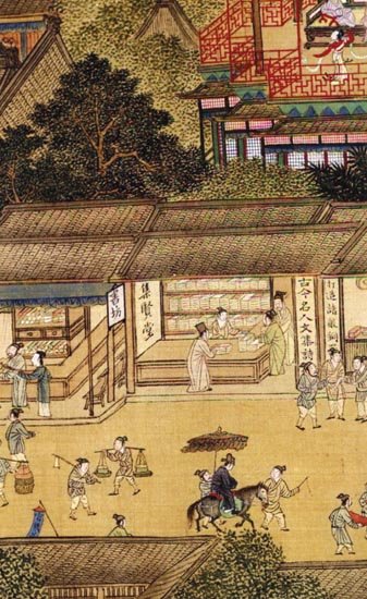 畫中大街小巷,店鋪林立,酒店、茶館、點(diǎn)心鋪等百肆雜陳,還有城樓、河港、橋梁、貨船、官府宅第和茅棚村舍密集。這樣波瀾壯闊的社會(huì)風(fēng)俗畫卷,世所罕見。