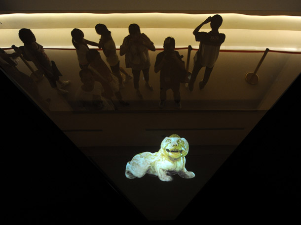6月27日,游客在震旦館參觀由全息成像技術(shù)再現(xiàn)的玉器三維圖像。新華社記者 燕雁 攝