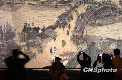 2010年5月9日,上海世博園中國館內100多米長卷的《清明上河圖》,引來眾多觀眾駐足。依托高科技演繹動感的《清明上河圖》給參觀者新奇與不同感受。 中新社發 (吳芒子 攝)