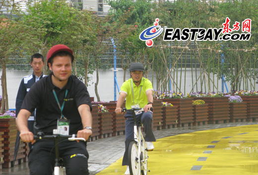 在浦西城市最佳實踐區歐登塞展館,昔日體操王子李寧過了一把騎車癮
