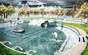 水廣場由幾個形狀、大小和高度各不相同的水池組成,水池間有渠相連。平時是市民娛樂休閑的廣場;暴雨來臨,就變成一個防澇系統(tǒng)。由于雨水流向地勢更低洼的水廣場,街道上就不會有積水。所有水池布成一張循環(huán)網(wǎng)絡(luò),雨量大時,從大水池中分流到溝渠,雨量小時,水又回流入大水池。雨水不僅可在水池間循環(huán)流動,還能被抽取儲存為淡水資源。