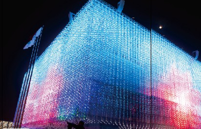 上海企業聯合館,又名“魔方”,它通過一系列智能技術,帶給參觀者夢幻般的意境以及妙趣橫生的互動體驗。外立面材料采用廢棄光盤加工而成,內部運用太陽能熱水發電、雨水收集等技術,是一座名副其實的生態建筑。