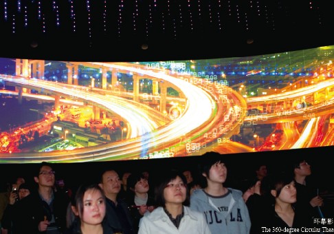 走廊盡頭的“魔方控制室”是一個360°環幕影院。由徐靜蕾扮演的蝴蝶教授為你講述一段有關“城市夢想”的故事,詮釋“破繭成蝶”的寓意。在燈光、音效的配合下,電閃雷鳴、波濤洶涌、紅日初升等逼真畫面讓人身臨其境。值得一提的是,在“魔方”外,架設了多臺實時攝像機,這些影像將通過直播信號傳輸到劇院屏幕上,當參觀者跟隨“蝴蝶教授”一起鼓掌、揮手時,將目睹整個“魔方”變換新裝的動態。