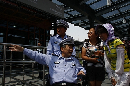 東方網5月26日消息:據《東方早報》報道,昨天上午,世博秦皇島路水門碼頭上,出現了這樣一幕:一名交警坐著輪椅“執勤”,解答過往游客的問題。他叫喬明德,是楊浦交警支隊的民警,今年7月將退休,一個月前被診斷出患有肝癌。昨天,他實現心愿——為世博出一份力,站一班崗。