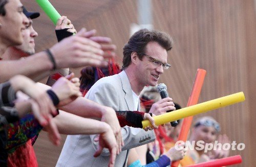 資料圖:5月14日,加拿大的藝術團在上海世博會上演了一場精彩的馬戲表演,吸引了眾多游客冒雨觀看。圖為大山主持表演。 中新社發(fā) 杜洋 攝