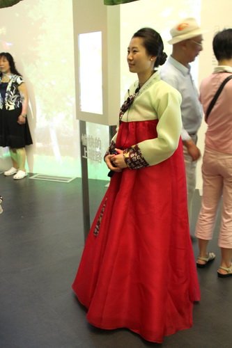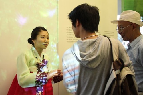 “請點擊屏幕上這個箭頭,就可以開始游戲了,電腦上一共有10個小游戲,都是有關節能環保主題的……”在2樓的“自然”展區,姜寶蘭操著一口流利的漢語,微笑著為游客們講解,聲音中帶著韓國傳統女性特有的溫柔。“頭上的綠色織物是用韓國傳統工藝織成的麻布,象征著綠色的大森林。”站在綠色的布幔之下,身著紅色韓服的姜寶蘭顯得甜美可愛。不斷有游客上前要求與她合影,姜寶蘭打著手勢拒絕了,有些羞澀的躲避著游客的鏡頭,“公司不允許,很抱歉。”