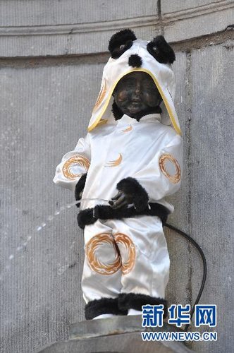 6月5日,比利時首都布魯塞爾著名的小尿童穿上了熊貓服。 當天,小尿童穿上了由中國四川省成都市贈送的熊貓服。在6月7日上海世博會成都館日上,比利時館的小尿童復制品也將穿上一件熊貓服。 新華社記者 武巍 攝