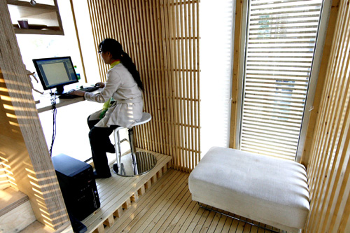 這座名為“可搬運的游客塔”的小房子,是一個來自葡萄牙的展示案例。這是一座占地僅九平方米的三層小樓,擁有二室一廳一廚二衛(wèi),可供兩人居住,四面的玻璃可采光,同時還具備吸收太陽能的功能,整座建筑呈長方體,橫臥可借助平板汽車搬運。在三樓的小陽臺上,陳龍坐在一把舒服的椅子上,想象著住在這里晚上抬頭看星星的感覺。三樓的臥室是一張不到二米寬的榻榻米,并帶有一個小型衛(wèi)生間。推開玻璃門,可達(dá)屋外的陽臺,與大自然親密接觸。二樓是書房,除了有一張書桌外,還可容納一張寬大的單人沙發(fā),看書上網(wǎng),累了還可在沙發(fā)上小憩片刻。