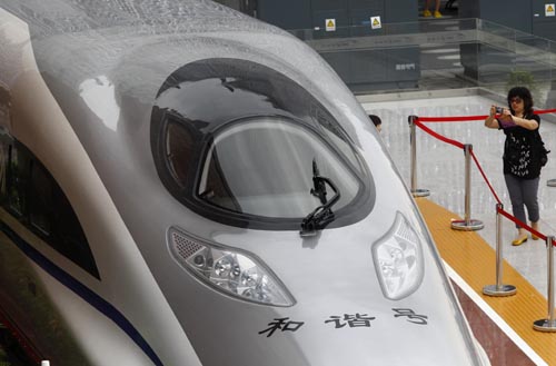 6月10日,一名小游客從CRH380A高速動車旁經過。新華社記者 裴鑫 攝