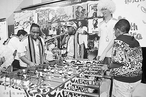 6月11日,觀眾在世博會(huì)南非館門口玩桌上足球游戲。本報(bào)記者 周凱攝